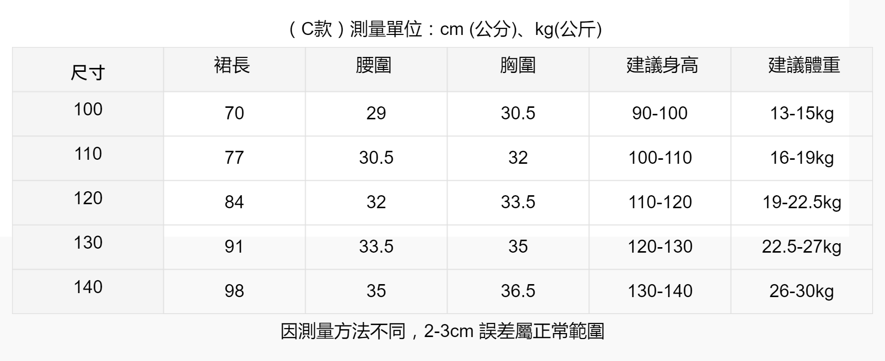 尺寸:100/110/120/130/140