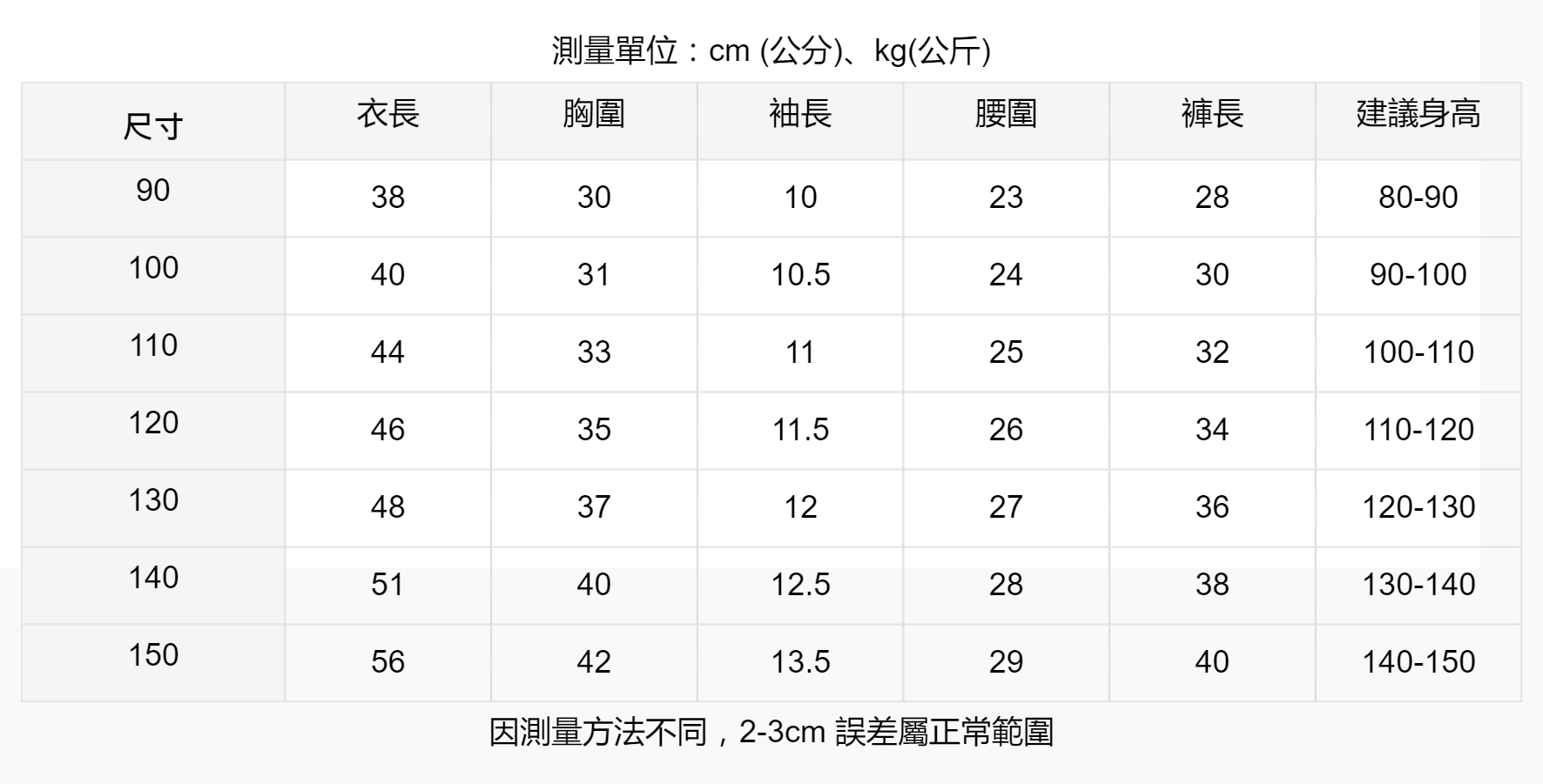 尺寸;90-150碼